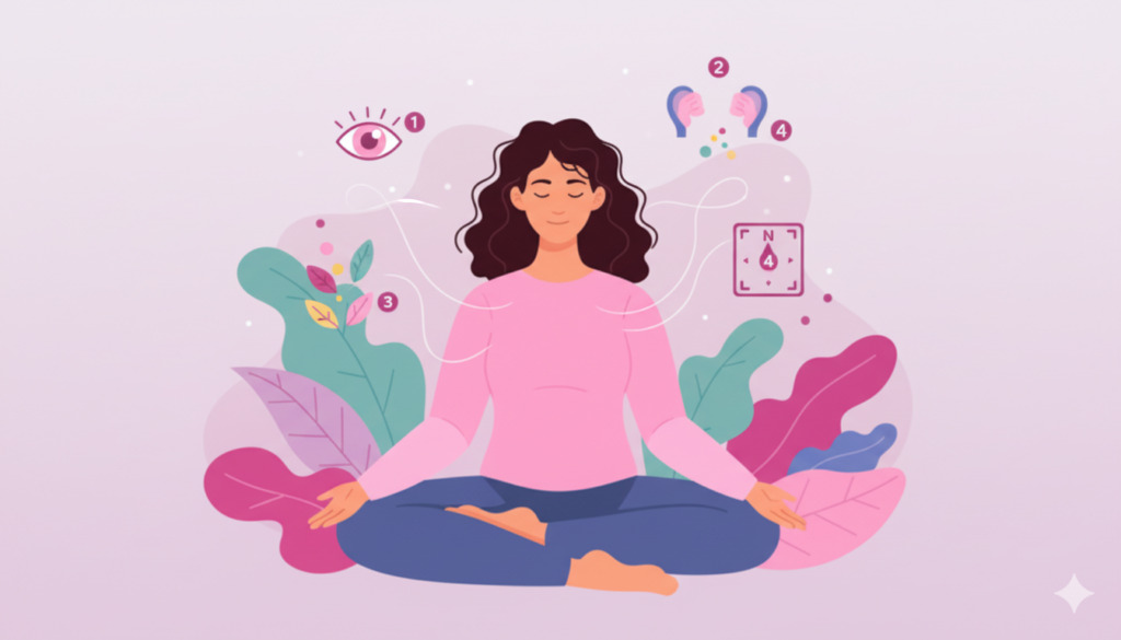 وقتی اضطراب به سراغمان میآید، ذهن شروع میکند به سفر در آینده یا غرق شدن در افکار منفی. این تمرین ساده به شما کمک میکند تا از آن مارپیچ ذهنی بیرون بیایید و دوباره به بدن و لحظهی اکنون بازگردید — جایی که امنیت، زمینگیری و آرامش بیشتر در دسترس است.